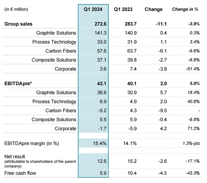 SGL Carbon最大的业务部门石墨解决方案(Graphite Solutions)部门2024年第一季度的销售额为1.413亿欧元,与2023年同期1.409亿欧元几乎持平;工艺技术业务部门营收3300万欧元,与去年同期3190万欧元相比,销售额增长了3.4%,利润提高了40.8%。碳纤维业务部门2024年第一季度销售额为5760万欧元,与去年同期6370万欧元相比下降了9.6%,下降的主要原因是风电行业的需求持续疲软,以及碳纤维业务的相关产能调整;碳纤维部门调整后EBITDA环比下降950万欧元,降至负520万欧元(2023年第一季度:430万欧元)。复合解决方案业务部门2024年第一季度的收入3710万欧元,与2023年第一季度同期3980万欧元相比,下降了6.8%。下降的原因是与一家汽车客户的项目相关供应合同到期。
