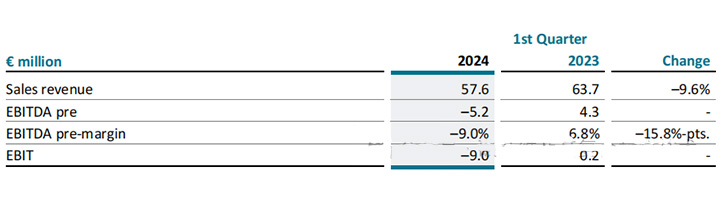 由于风电行业的需求预计在未来几个月内不会恢复,除了降低产能外,公司还启动了碳纤维的重组计划。启动的重组措施导致2024年第一季度支出180万欧元,被列为非经常性项目。考虑到非经常性项目和基于2023财年进行的减值的较低折旧和摊销(减去220万欧元),第一季度的EBIT总额为减去900万欧元(2023年第一季度:20万欧元)。