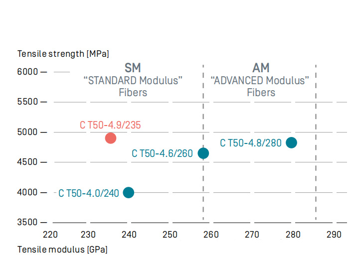 从碳纤维产品类型来看,SGL Carbon公司目前的碳纤维产品全部为50k规格的大丝束碳纤维,公司碳纤维产品型号的意义,以最新研发成功的C T50-4.9/235为例(延伸阅读<颠覆性突破!西格里新款50K大丝束碳纤维兼具小丝束纤维性能>),其中C—carbon,T—Continuous tow 连续丝束,50—纤维丝束数量,4.9/235—连续纤维强度和模量,因此其意义为50k丝束规格的拉伸强度4.9GPa、拉伸模量235GPa的碳纤维。大丝束碳纤维有其成本优势,但同样有性能局限性,公司碳纤维强度普遍低于5.0GPa以下。