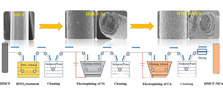 经过电化学镀处理后可在纤维表面均匀引入镍、铜、铝等不同类型的金属镀层,镀层厚度可控;与此同时,处理后碳纤维力学性能几乎无损失,而且导电性能大幅提升。经测试,镀金属碳纤维的电阻能够低至2欧姆每米;本技术适用于1-24K丝束碳纤维的金属化。
