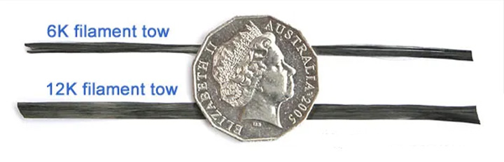 众所周知,碳纤维为束丝材料,根据纤维内丝束的大小,碳纤维又可以分为小丝束碳纤维(丝束数量≤24K)和大丝束碳纤维(丝束数量>24K),其中的K代表束丝中有一千根单丝,比如3K规格碳纤维表示每束碳纤维中有3,000根单丝,而12K碳纤维则表示每束碳纤维中有12,000根单丝。