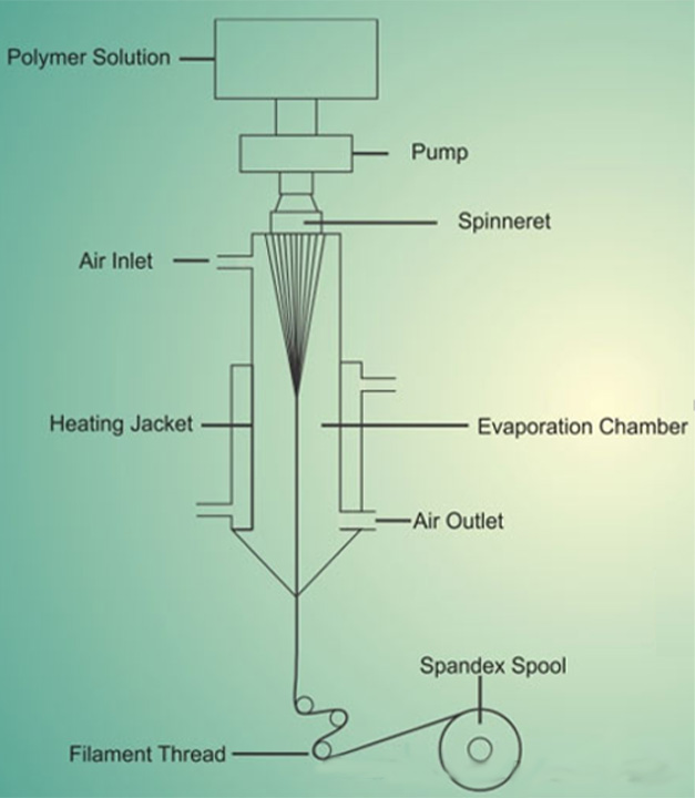 目前高性能纤维常见的纺丝方法主要分为两大类:熔融纺丝和溶液纺丝,其中溶液纺丝可以分为干式溶液纺丝(干法)和湿式溶液纺丝(包括湿法纺丝和干喷湿纺)。干法纺丝是把PAN纺丝液通过计量泵和喷丝板喷挤到有气体流动的纺丝筒(干燥筒)中,溶剂挥发而凝固成纤。