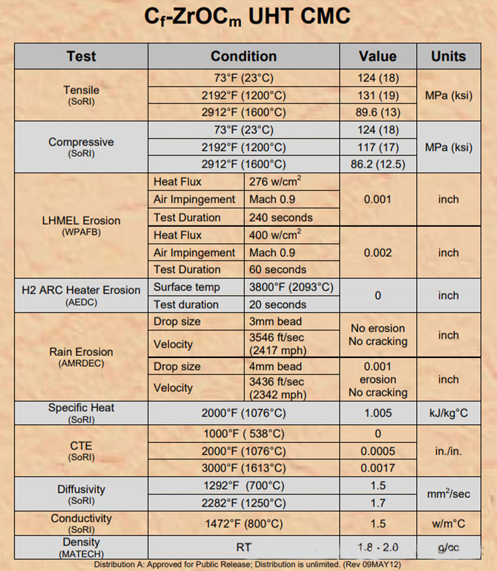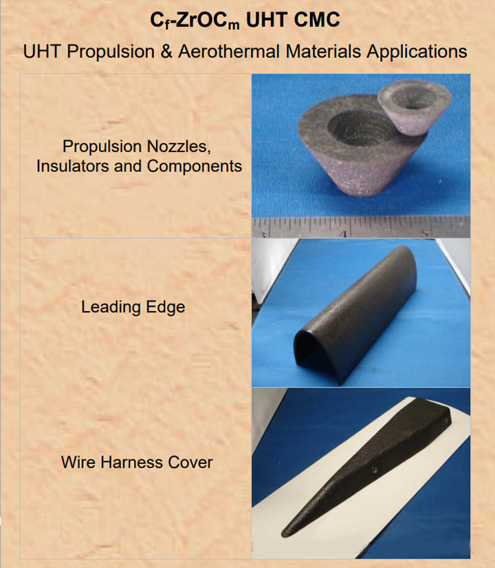 碳-碳(C/C)复合材料最早是在1958年作为弹道再入鼻尖材料开发的,虽然高密度碳-碳(HDCC)复合材料性能优异,但在高温和滞流压力下,其烧蚀率非常高。基于此MATECH公司开发了一种极低烧蚀率的高超音速材料,这种被称为C/ZrOC复合材料成本低、可大规模生产且易于制造。在美国导弹防御局的大力支持下,MATECH将其超高温(UHT)C/ZrOC TPS和推进变型系统达到了高超音速和导弹防御应用的资格预审状态。这些是专门为满足关键国防和民用太空需求的高性能和易制造而开发的。