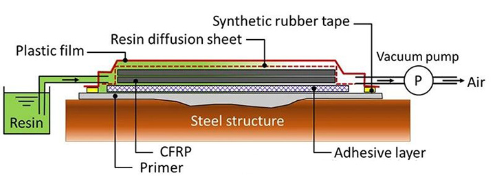 目前FPSO和FSO的设备维护通常是在海上进行并使用传统的钢材进行维修,但是在焊接或动火作业时,会导致止石油和天然气的生产中止。早在2020年,日本东丽公司联合MODEC(三井海洋开发株式会社)公司共同开发了VaRTM修复工艺,该工艺需要将东丽的TORAYCA™碳纤维织物应用于现有钢结构的表面。这种织物具有优异的强度和模量,碳纤维织物用于金属表面后会使用薄膜覆盖织物,然后用真空泵进行真空密封,注入环氧树脂,然后使之固化从而形成CFRP和钢结构的一体化,从而完成修复。