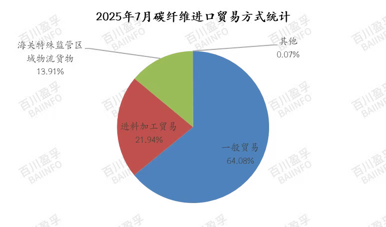 从贸易方式来看,2025年7月我国碳纤维进口主要为一般贸易和进料加工贸易,其中一般贸易进口碳纤维数量为358.002吨,占比64.08%,进料加工贸易进口碳纤维数量为122.555吨,占比为21.94%。