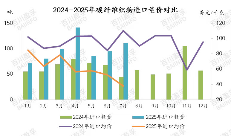 2025年7月碳纤维织物进口总量111.485吨,同比增加147.71%,环比增加16.92%。其进口主要来自德国和日本,进口数量分别为80.961吨和10.3吨。碳纤维织物进口均价为37.84美元/千克,其中日本碳纤维织物进口均价为82.69美元/千克。